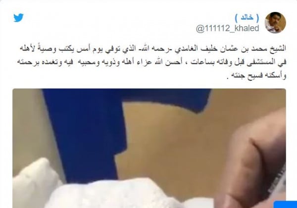 حقق مقطع فيديو مؤثر لمسن انهمك في كتابة وصيته على سرير إحدى المستشفيات في السعودية قبل أن تداهمه الوفاة، نسب مشاهدة عالية فور نشره في مواقع التواصل الاجتماعي.