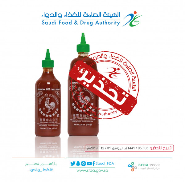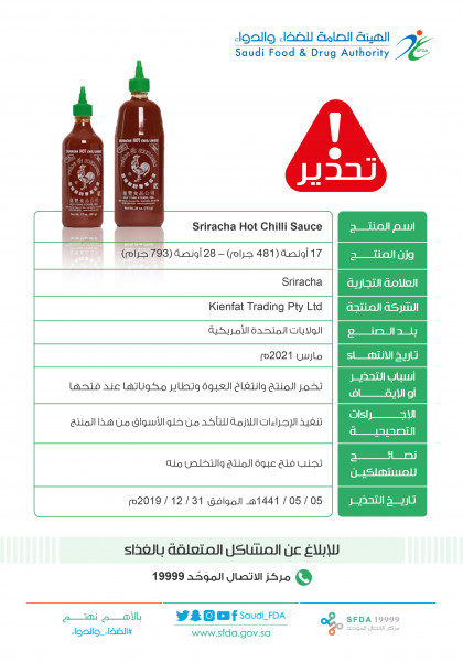 حذّرت الهيئة العامة للغذاء والدواء من منتج صلصة الفلفل الحار للعلامة التجارية (سريشيا) بسبب خلل في تعبئة المنتج