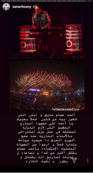 وكان النجم تامر حسنى اول من هنأ احمد عصام على الحفل حيث كتب على خاصية ستوري الانستغرام :" أحمد عصام صديق و ابني اللي فخور بيه من قلبي فعلا بحييك يا أحمد على مجهودك امبارح العظيم اللي لازم الدولة تستغله في عمل عرض استعراضي بالألعاب النارية عند سفح الهرم العرض دا هيفيد سياحة بلدنا فعلا و ارجوا من الجهات المعنية الاستفادة باحمد عصام بشكل أكبر من كدا و نساعده و نديله تصاريح أنه يشتغل و يطور و نشوف افكاره.