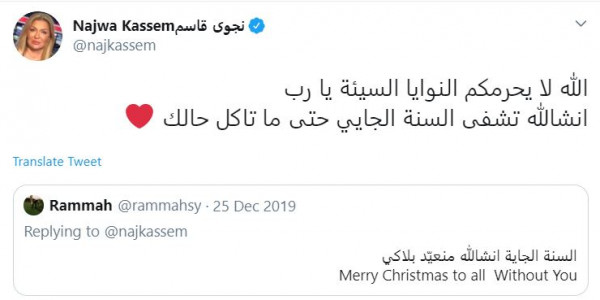 ردت عليه الإعلامية اللبنانية قائلة عبر تويتر :"الله لا يحرمكم النوايا السيئة يا رب ان شاء الله تشفي السنة الجاية حتى ما تاكل حالك".