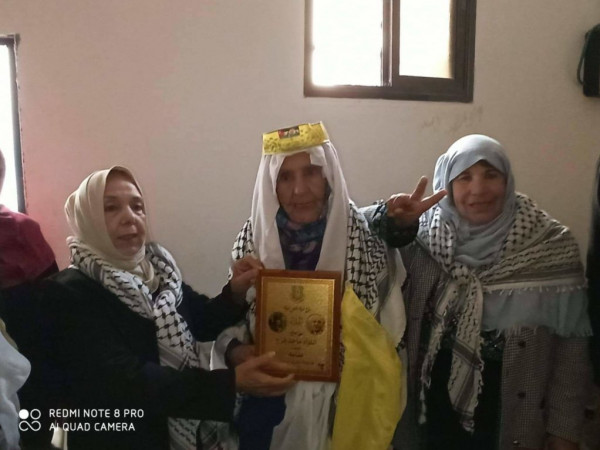 وقدمت درع التكريم اللواء متقاعد نفوذ الفرا للمناضلة فاطمة الجرف والتي تسكن شرق خانيونس ببلدة عبسان الصغيرة.