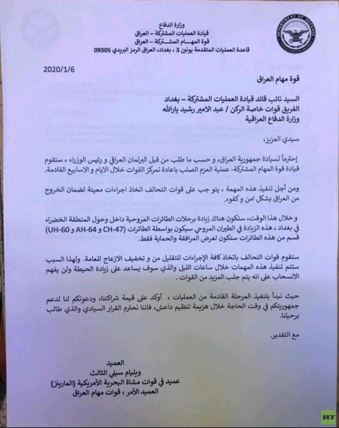 قالت (روسيا اليوم): إن الجيش الأمريكي أبلغ السلطات العراقية باتخاذه إجراءات للانسحاب من البلاد.