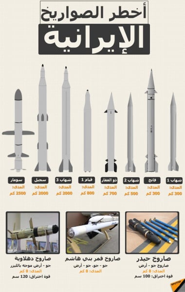 وتضم ترسانة الصواريخ الإيرانية صواريخ قصيرة المدى، أبرزها صواريخ "شهاب 1" و"شهاب 2"، وأخرى متوسطة المدى، أبرزها صواريخ "سجيل" و"شهاب 3"، إضافة إلى صواريخ خارقة للدروع قصيرة المدى يمكن استخدامها ضد أهداف بحرية.