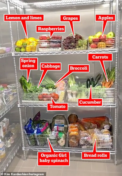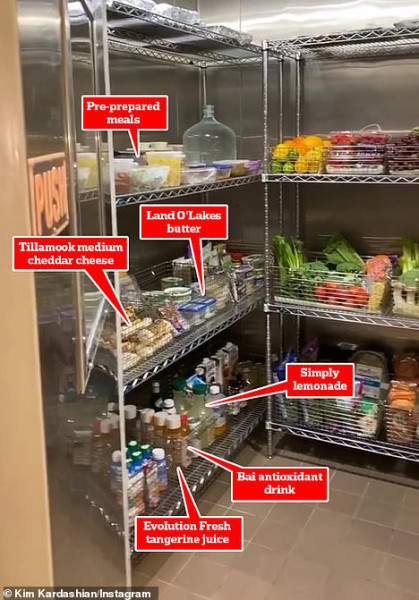 وبحسب "الديلي ميل"، ظهرت كيم وهي تستعرض ما يوجد داخل الثلاجة وقد تم تقسيمها بشكل متميز إلى رفوف تحتوي كل منها على الأطعمة والمشروبات بأنواعها.