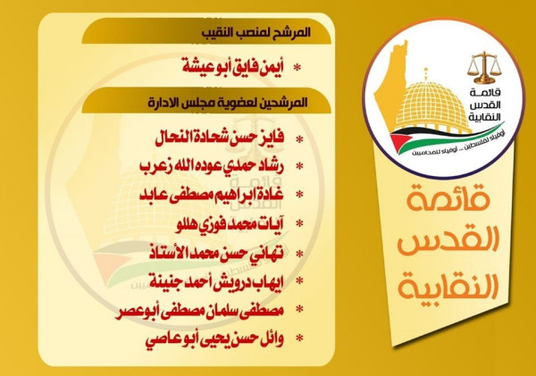 وكان الاتحاد الإسلامي في نقابة المحامين، قد نشر أسماء قائمة "القدس النقابية" حيث جاء أيمن فايق أبو عيشة، كمرشح لمنصب النقيب، وفيما يلي أسماء المرشحين لعضوية مجلس الإدارة: