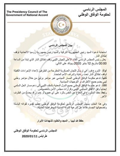 وقالت الوفاق في بيان، نشرته على حسابها الرسمي بموقع (فيسبوك): "يعلن رئيس المجلس الرئاسي القائد الأعلى للجيش الليبي، وقف إطلاق النار، الذي يبدأ من الساعة 00:00 بتاريخ 12 يناير 2020".