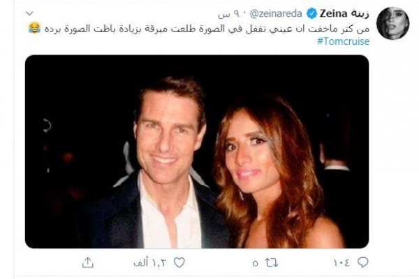 شاركت الفنانة زينة، متابعيها عبر حسابها الرسمي على موقع التدوينات القصيرة "تويتر"، صورة جديدة لها برفقة الممثل العالمي توم كروز، وأرفقت تعليقًا على الصورة، "من كتر ما خفت أن عيني تقفل في الصورة طلعت مبرقة بزيادة باظت الصورة برده".