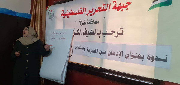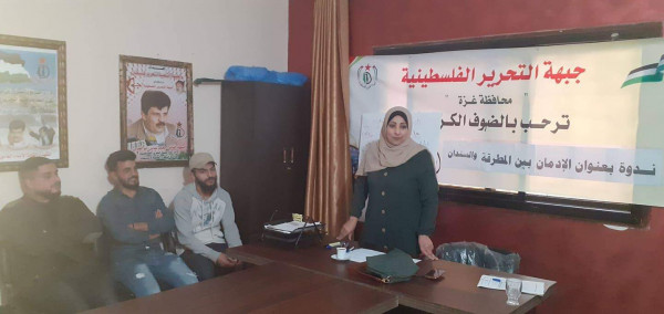 في اطار دورها التثقيفية والتربوية، نظمت كتلة تحرير المراة بجبهة التحرير الفلسطينية صباح اليوم في مكتبها بمدينة غزة ندوة توعوية بعنوان " الإدمان بين المطرقة والسندان" التى كانت ضيفتها الأستاذة نهيل قنيطة.