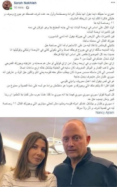 عادت الفنانة وملكة جمال سوريا السابقة سارة نخلة، لمهاجمة الفنانة اللبنانية، نانسي عجرم، بسبب واقعة الشاب السوري المقتول في منزلها، وذلك عقب توجيه تهمة القتل العمد لزوج الفنانة اللبنانية، فادي الهاشم، اليوم.