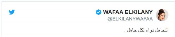 وسبق أن نشرت وفاء الكيلاني تغريدة تقول فيها: "التجاهل داء لكل جاهل"، الأمر الذي جعل المتابعين يتفاعلون بتعليقات تشير إلى أن الرجال دائمًا يتجاهلون ولكن ليس لهم دواء، مطالبين بعدم بذل مجهود أو محاولات لتغيير الأمر، غير أن البعض ذهب لبعيد وقالوا: "بس ما هو منيح إن زوجك يتجاهلك بهالطريقة أنت جميلة".