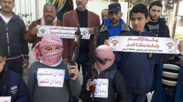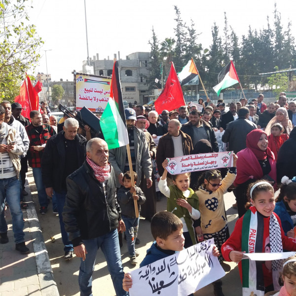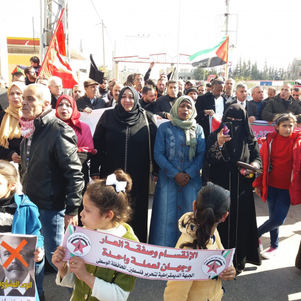 ورفع المشاركون شعارات منددة بالصفقة المشؤومة وسط هتافات تدعو للوحدة الوطنية وإنهاء الانقسام.