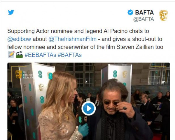 وكان باتشينو حضر حفل توزيع جوائز الـBAFTA، حيث ظهر وقام بالتسجيل مع وسائل الإعلام.