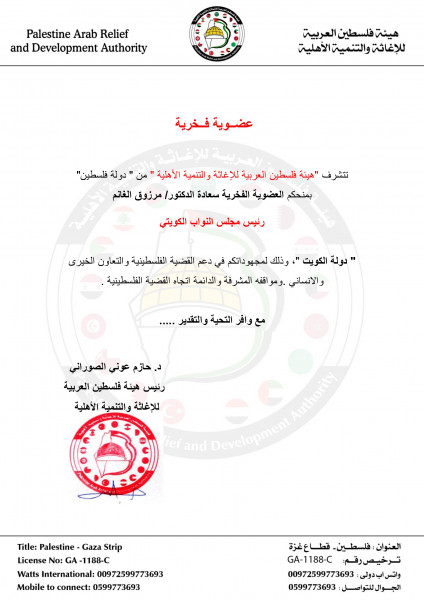 منحت هيئة فلسطين العربية للإغاثة والتنمية الأهلية رئيس مجلس الأمة الكويتي، مرزوق الغانم العضوية الفخرية للهيئة.