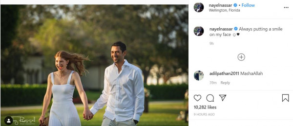 وظهر العروسان وهما يرتديان نفس اللون "الأبيض"، وعلق نصار على الصورة: "دائما تضع الابتسامة على وجهي".