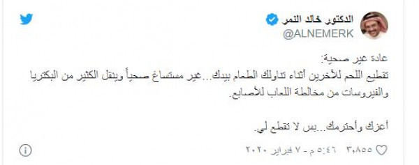 وقال: "عادة غير صحية: تقطيع اللحم للآخرين أثناء تناولك الطعام بيدك… غير مستساغ صحيا وينقل الكثير من البكتريا والفيروسات من مخالطة اللعاب للأصابع".