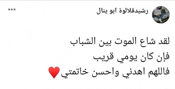 وكان آخر ما كتبه الشاب قلالوة، عبر صفحته الشخصية على (فيسبوك) قبل يوم من الحادثة: "لقد شاع الموت بين الشباب، فإن كان يومي قريب، فاللهم اهدني وأحسن خاتمتي".