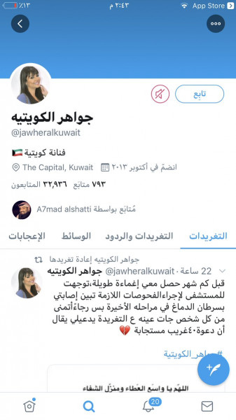 وكانت الإعلامية الكويتية مي العيدان أعلنت في وقت سابق عن إصابة مواطنتها جواهر بالسرطان، قائلة في منشور لها "الفنانه جواهر الكويتيه تقاوم مرض السرطان وبمرحلة خطيرة.. دعواتكم لها ياجماعة، الله يشافيها مافي شي بعيد عن ربنا".