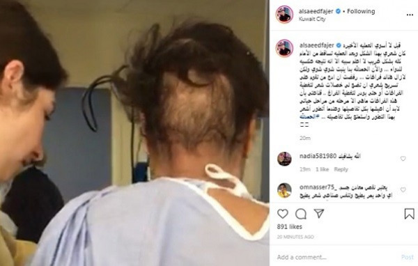 بحسب مجلة "جولولي"، الإعلامية الكويتية نشرت صورة صادمة كشفت عن تساقط أغلب شعرها من الخلف، وعلقت بقولها: "قبل لا أسوي العمليه الأخيره كان شعري بهذا الشكل وبعد العمليه تساقط من الأمام كله بشكل غريب لا اعلم سببه الا انه نتيجه عكسيه للدواء".