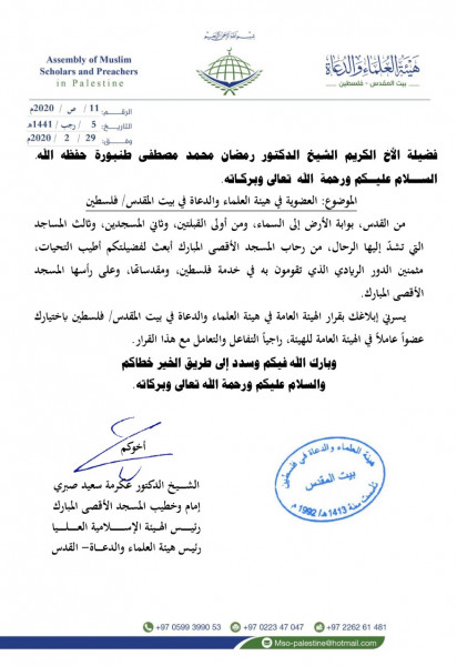 أعلنت هيئة العلماء والدعاة في بيت المقدس عن اختيار الشيخ
