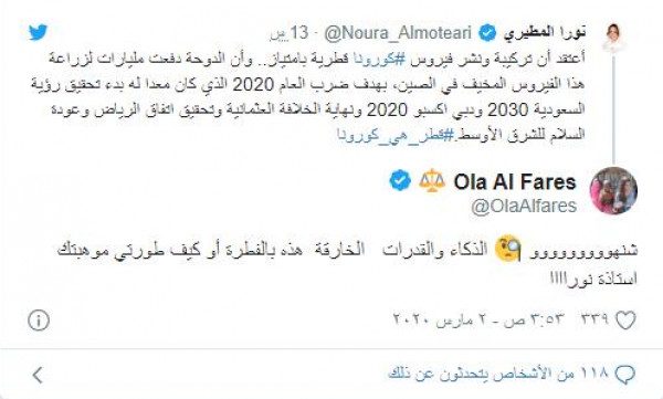 حيث غردت تورا المطيري عبر حسابها على تويتر وفق ما نقلته (نورت): "أعتقد أن تركيبة ونشر فيروس كورونا قطرية بامتياز.. وأن الدوحة دفعت مليارات لزراعة هذا الفيروس المخيف في الصين، بهدف ضرب العام 2020 الذي كان معدا له بدء تحقيق رؤية السعودية 2030 ودبي اكسبو 2020 ونهاية الخلافة العثمانية وتحقيق اتفاق الرياض وعودة السلام للشرق الأوسط."