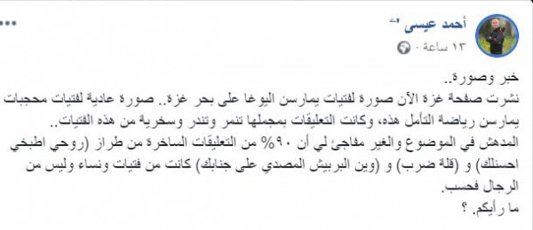 هذه الصور التي قسمت رواد الفضاء الأزرق الى مؤيدين لهذه الرياضة وممارستها من قبل الفتيات في الهواء الطلق، ومعارضين اعتبروها خارجة عن تقاليد المجتمع المحافظ الغزي كما يبررون.