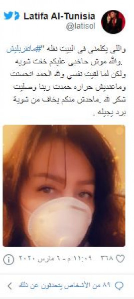 وبعد تعافيها من "الإنفلونزا" قالت عبر "تويتر": "اللى يكلمنى في البيت نقله ماتقربليش، والله موش حاخبى عليكم خفت شوية ولكن لما لقيت نفسي ولله الحمد اتحسنت وماعنديش حرارة حمدت ربنا وصليت شكر لله".