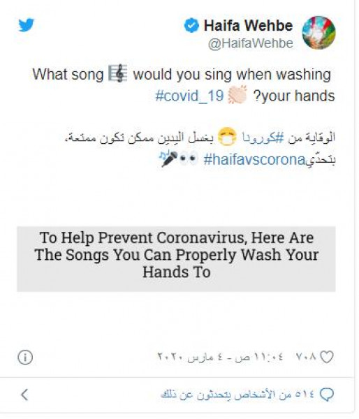 وأنهت لطيفة كلماتها: "ماحدش منكم يخاف من شوية برد يجي له"، وسرعان ما حاولت الفنانة هيفاء وهبي اللحاق بقائمة الفنانين، عن طريق تعاملها بإيجابية مع الفيروس، وإطلاقها تحدّي لغسل اليدين مع الغناء، وتفاعل عدد من الأطفال مع فكرتها مُشاركين بالتحدي، الذي أطلقت عليه "هيفاء vs كورونا"، وقالت عبر (تويتر): "الوقاية من كورونا بغسل اليدين ممكن تكون ممتعة".