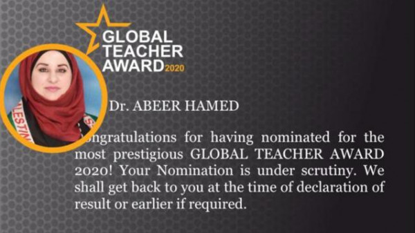 رشحت المعلمة والإعلامية والدكتورة الرائدة الفلسطينية عبير حامد لجائزة المعلم العالمية في التعليم 2020 في الهند والتنافس ضمن أفضل 100 معلم حول العالم.
