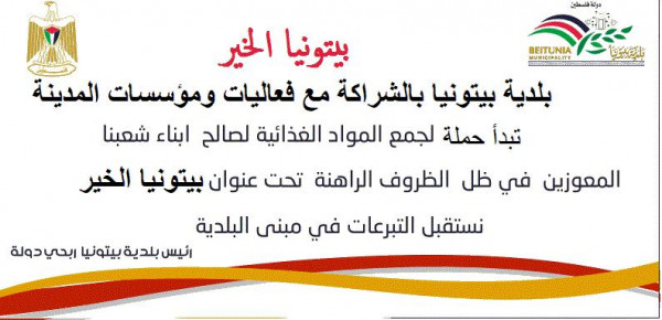 أنهت طواقم الطوارئ في بلدية ومدينة بيتونيا، وبالشراكة مع مؤسسات وفعاليات المدينة ، وضمن الالتزام بتعليمات الرئيس محمود عباس ورئيس الوزراء الدكتور محمد اشتية ، أنهت كافة استعداداتها لإطلاق حملة لجمع مساعدات إنسانية واغاثية تحت عنوان بيتونيا الخير وهي حملة إغاثة من أهالي بيتونيا الى المعوزين من ابناء شعبنا في ظل حالة الطوارىء والعمل ضمنها في اطار عدم تمكن الجميع من الوصول الى اماكن عملهم او تعطل من يعمل داخل الخط الأخضر.