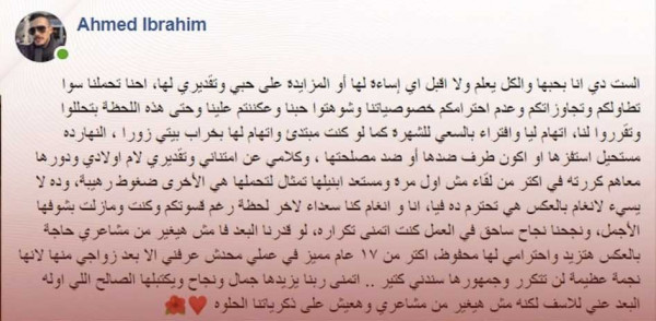 أضاف: "لو قدرنا البعد فا مش هيغير من مشاعري حاجة بالعكس هتزيد واحترامي لها محفوظ، أكتر من ١٧ عام مميز في عملي محدش عرفني إلا بعد زواجي منها لأنها نجمة عظيمة لن تتكرر وجمهورها سندني كتير.. أتمنى ربنا يزيدها جمال ونجاح ويكتبلها الصالح اللي أوله البعد عني للأسف لكنه مش هيغير من مشاعري وهعيش على ذكرياتنا الحلوة".