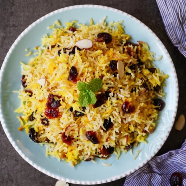 اسكبي الأرز في طبق التقديم ووزعي الزبيب على الوجه.