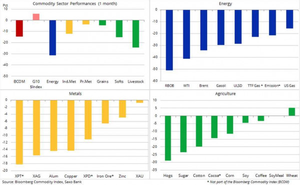 وتأثرت السلع الأساسية سلباً في معظم الأحيان، بالنظر إلى الأداء الإيجابي السابق لسلاسل التوريد ومستويات النمو والطلب. وقد تحمّل النفط الخام والمنتجات ذات الصلة العبء الأكبر نتيجة انهيار الطلب بنحو 25+ مليون برميل يومياً. لكن حظي النفط بالمُقابل بفرص صعودٍ خلال نهاية الأسبوع، بعد انهيار سعره الإجمالي في ضوء تنامي المخاطر بنفاذ الكميات المخزنة في غضون أشهرٍ قليلة. ونُرجج أن يتجدد الأمل في السوق بعد توصل المنتجين الرئيسيين داخل وخارج منظمة أوبك إلى اتفاقٍ لخفض طارئٍ في إنتاج النفط.