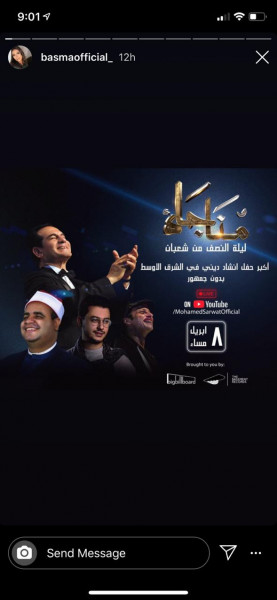 دعت النجمة السينمائية بسمة، من خلال صفحتها الرسمية على الانستجرام معجبيها لمتابعة حفل "مناجاة" ليلة النصف من شعبان للفنان محمد ثروت. وقد لاقا المنشور إعجاب كبير من قبل متابعي الفنانة بسمة.