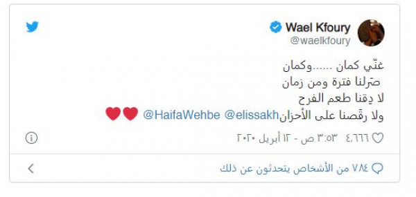 وكتب النجم اللبناني تغريدة عبر حسابه على موقع "تويتر" قائلاً: "غنّي كمان وكمان صَرلنا فترة ومن زمان لا دِقنا طعم الفرح ولا رقَصنا على الأحزان" بحسب (مجلة لها).