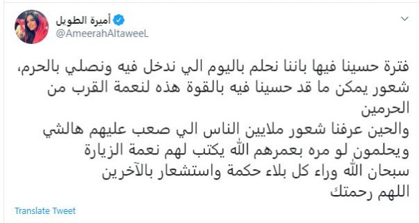 وكتبت أميرة: "فترة حسينا فيها بأننا نحلم باليوم الذي ندخل فيه ونصلي بالحرم، شعور يمكن ما قد حسينا فيه بالقوة هذه لنعمة القرب من الحرمين والحين عرفنا شعور ملايين الناس الي صعب عليهم هالشي ويحلمون لو مرة بعمرهم الله يكتب لهم نعمة الزيارة سبحان الله وراء كل بلاء حكمة واستشعار بالآخرين اللهم رحمتك".