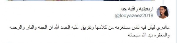 لكن آخرون دافعوا عن حديثها، فقالت مغردة: "ما أدري ليش فيه ناس مستغربة كلامها وتتريق عليه الحمدلله إن الجنة والنار والرحمة والمغفرة بيد الله سبحانه".