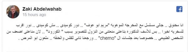 وكتب فطين عبر حسابه على "الفيسبوك": "أنا مخنوق.. جالي مسلسل مع المخرجة الموهوبة "مريم ابو عوف".. دور كوميدي.. مش كوميدي.. دور أقرب للسخرية أخيرا.. بس للأسف الدكتورة بتاعتي منعتنى من النزول للتصوير بسبب كورونا لأن مناعتي أضعف من الشخص الطبيعي .. خصوصا بعد جلسات ال "chemo".
