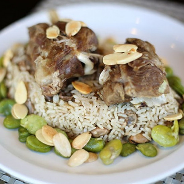 4. في صحن التقديم نسكب الأرز والفول ونضع فوقه قطع اللحم المسلوقة والمبهرة ونقوم بتزيين الصحن باللوز وبإمكانك تقديمه مع اللبن أو السلطة.