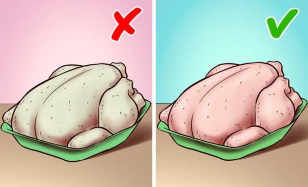 نحن بحاجة للتحقق من الألوان المختلفة لقطع الدجاج، فيجب أن تكون بشرة الدجاجة شاحبة أكثر من اللحم. إذا كان جلد الدجاج أصفر أو بنيا فاتحا، اتركه على الرف.