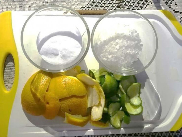 تقطع القشور إلى قطع صغيرة وتغلى في لتر ماء لمدة 5 دقائق، وعند الانتهاء، صفي الماء ودعيه يبرد ثم بعد ذلك، يتم مزج جميع المكونات لتشكيل معجون يمكنك سكبه في وعاء.