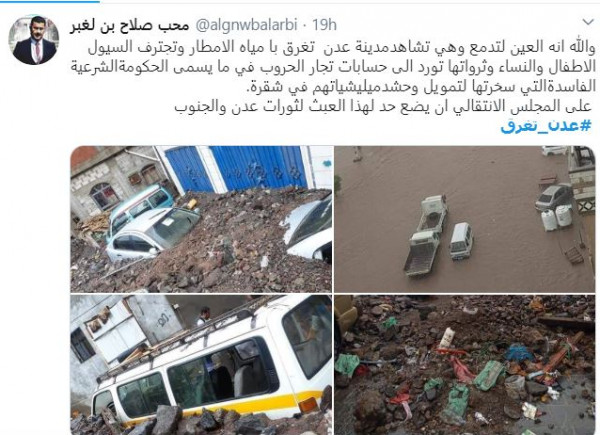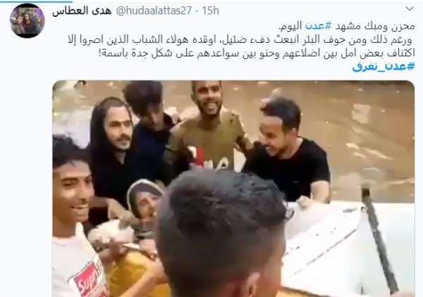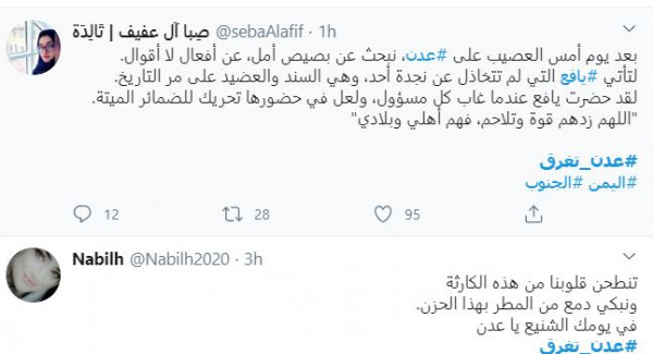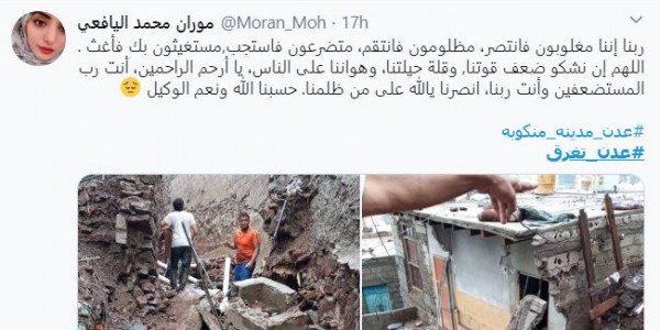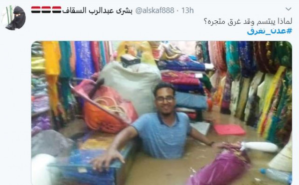 ودشن النشطاء هاشتاج #عدن_تغرق رصدوا خلالها غرق السيارات والممتلكات والمنازل، ونشرت إحدى المغردات فيديو يرصد لحظة انهيار مبنى سكني كامل وسط صراخ الحضور.