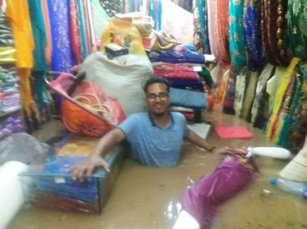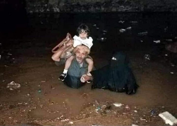 وظهرت بأحد الصور شاب يُنقذ كلباً من الغرق، وفي مشهد آخر مجموعة من الشباب تُلاحق مُسناً تتلاعب بجسده السيول الجارفة، وسط صراخ المحيطين به.