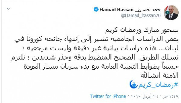 غرد وزير الصحة اللبناني، حمد حسن، على حسابه عبر (تويتر)، نافياً المعلومات التي تحدثت عن انتهاء جائحة فيروس (كورونا) في البلاد، مؤكداً أن وزارته تسير على الطريق الصحيح في هذا المجال.