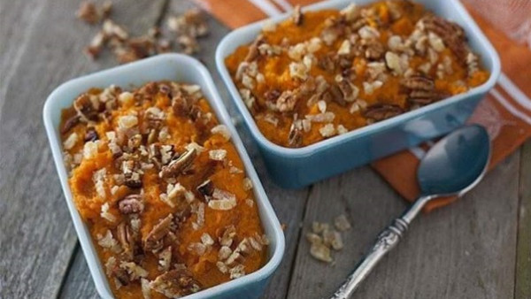 - يسخن الفرن على درجة حرارة 180 مئوية وفي وعاء نخلط البطاطا مع الزبدة والسكر البني وعصير الرتقال والفانيلا والبيض المخفوق ونقلب جيدا بواسطة معلقة خشبية حتى تتخلط المكونات جيدا.
