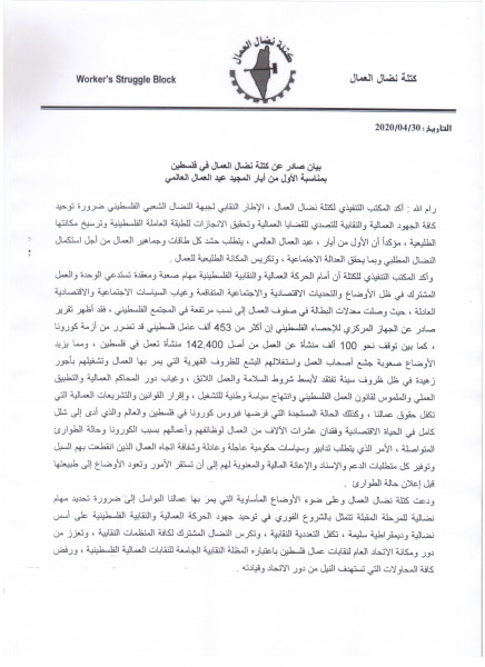 كتلة "نضال العمال" في فلسطين تصدر بياناً بمناسبة عيد العمال