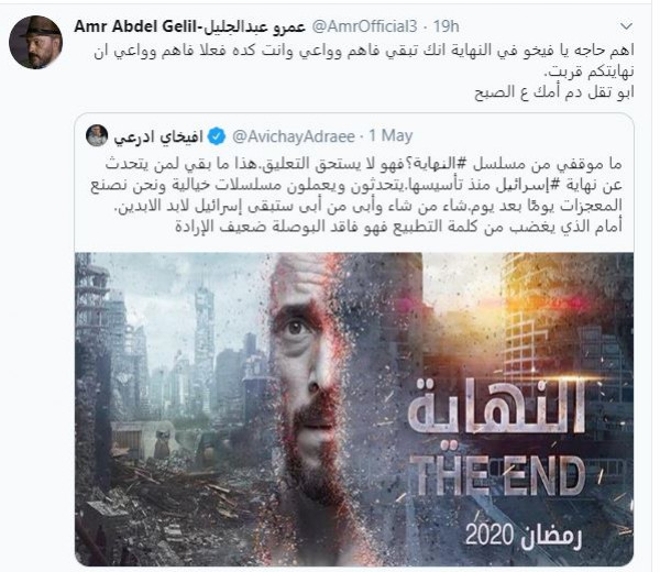وذلك بعد مُهاجمة أفيخاي للمسلسل عبر حسابه على (تويتر) قائلاً: "ما موقفي من مسلسل #النهاية؟ فهو لا يستحق التعليق. هذا ما بقي لمن يتحدث عن نهاية #إسرائيل منذ تأسيسها. يتحدثون ويعملون مسلسلات خيالية، ونحن نصنع المعجزات يومًا بعد يوم. شاء من شاء وأبى من أبى، ستبقى إسرائيل لأبد الآبدين، أمام الذي يغضب من كلمة التطبيع، فهو فاقد البوصلة ضعيف الإرادة".