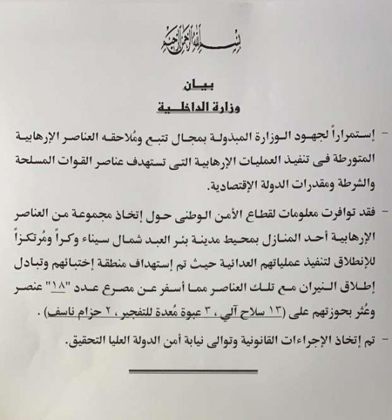 وأوضح بيان لوزارة الداخلية المصرية نقلته (العربية)، أنه قد توافرت معلومات لقطاع الأمن الوطني، بشأن اتخاذ عدد من العناصر الإرهابية منزلاً بمحيط مدينة بئر العبد بشمال سيناء وكراً ومرتكزاً للانطلاق؛ لتنفيذ عملياتهم العدائية، حيث تم استهداف منطقة اختبائهم، وتم تبادل إطلاق النار مع تلك العناصر، مما أسفر عن 18 عنصراً إرهابياً.