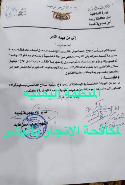 وأضافت المنظمة أن الأب استقر مع أطفاله في منطقة القفر (بني العمري) بمديرية الرضمة في محافظة إب، وكانت حالته النفسية قد ازدادت سوءاً، وتحت تأثير ذلك قام بعرض أولاده للبيع، فقام شخص من أبناء المنطقة يدعى بكيل صالح الفاطمي بأخذ الأطفال الأربعة، مستغلا الحالة النفسية للأب وأمضاه على تنازل خطي عن أولاده.