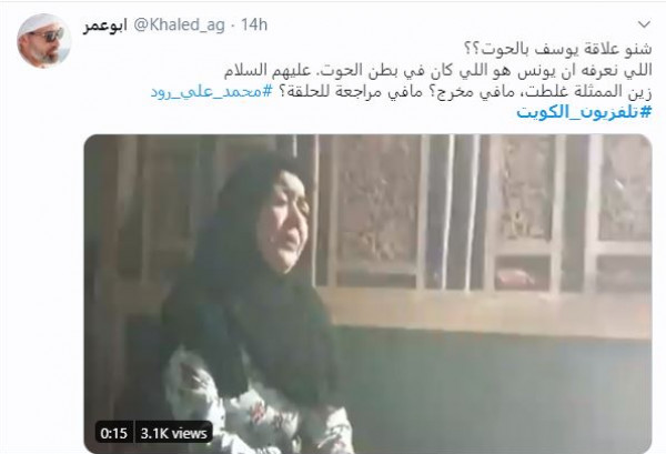 أثار مشهد من مسلسل "محمد علي رود" سخرية نشطاء مواقع التواصل الاجتماعي بعدما ظهرت الممثلة فاطمة الحوسني تدعو الله قائلة: "يا منجي يوسف من بطن الحوت".