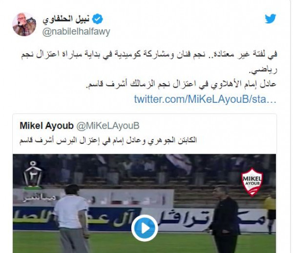 وعلق نبيل على الفيديو قائلاً: "في لفتة غير معتادة.. نجم فنان ومشاركة كوميدية في بداية مباراة اعتزال نجم رياضي. عادل إمام الأهلاوي في اعتزال نجم الزمالك أشرف قاسم".
